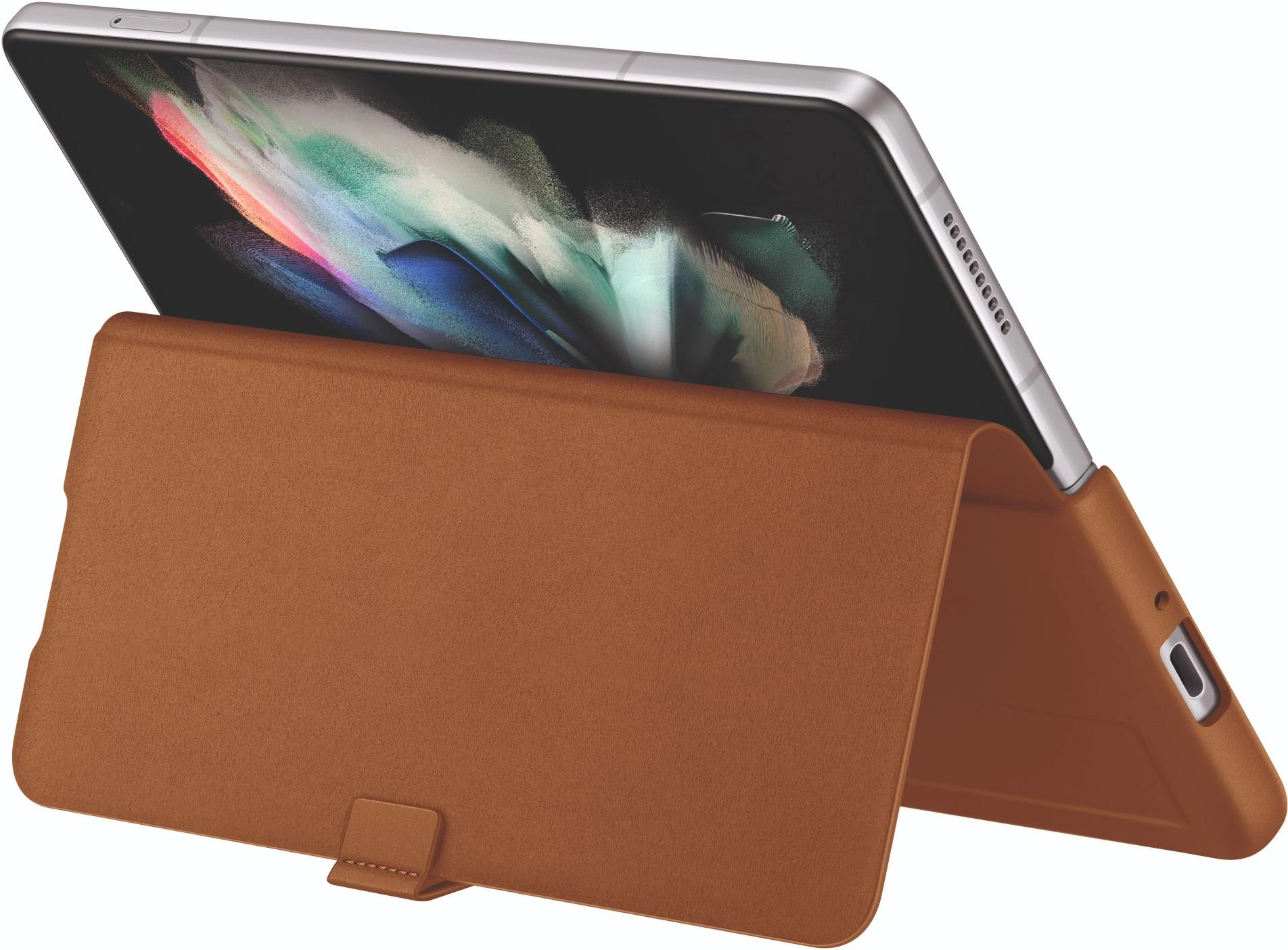 An der Rückseite des Covers ist ein Band befestigt, mit dem du dein Smartphone festhalten kannst. Und wenn du freihändig Inhalte auf deinem Galaxy Z Fold3 5G genießen möchtest, kannst du es ganz einfach auffalten und mithilfe des Standfußes sicher aufstellen.